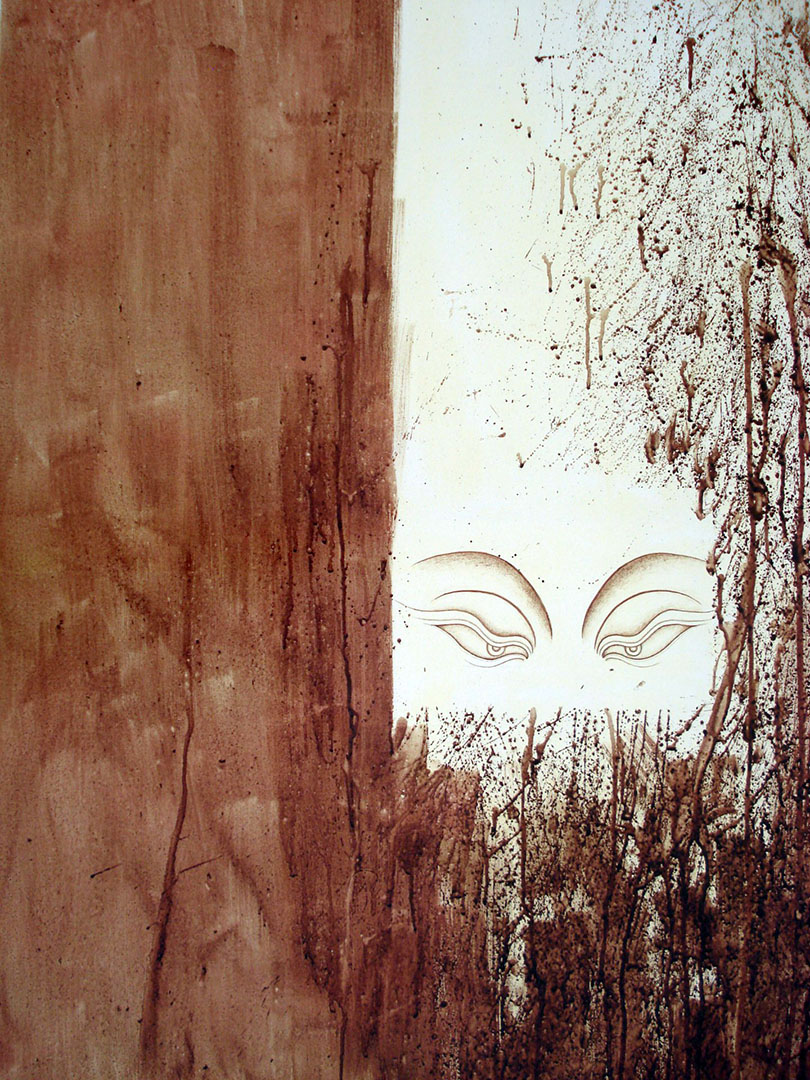 त्यो बेग्लाबेग्लै रगतको नमुनाबाट क्यानभासमा दुई शान्तिकामी आँखा बनाए । पृष्ठभूमिमा उनले आफ्नै रगत पोते । रगत त सबैको रातै हुन्छ, चित्रमा कुन आँखा सैनिक जवानको र कुन चाहिँ माओवादी छापामारको हो भनेर छुट्याउन सकिन्न । ‘त्यही नै हो समायोजन । त्यसबाट एउटा आँखा हटाउने बित्तिकै सन्तुलन बिगि्रन्छ,’ उनले अर्थ खुलाए ।